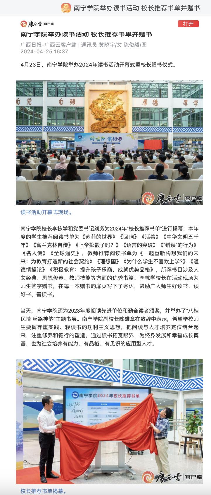 【媒体看南院】广西日报、广西电视台、南宁电视台等多家媒体报道我校举办2024年读书活动开幕式暨校长赠书仪式。
