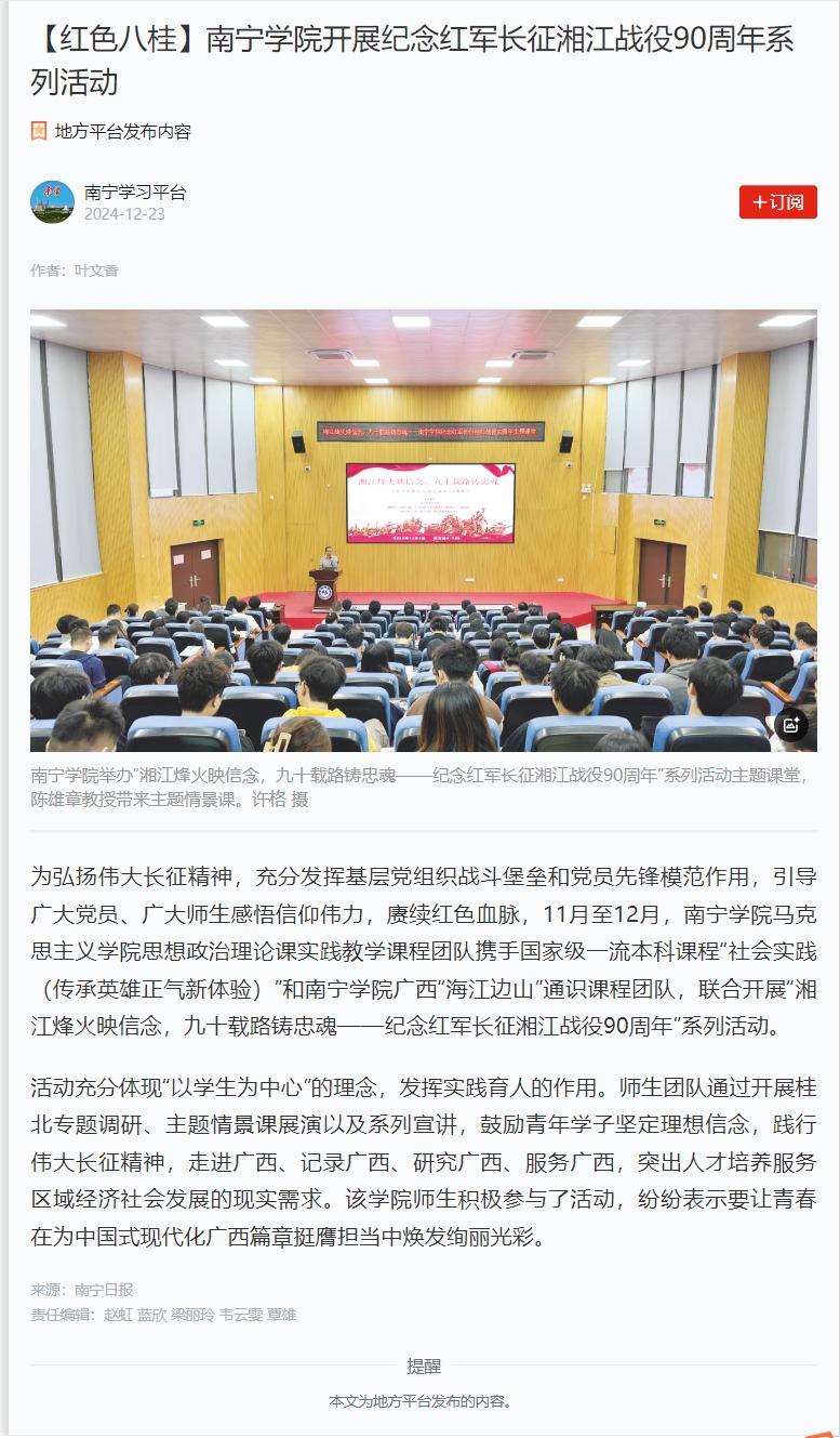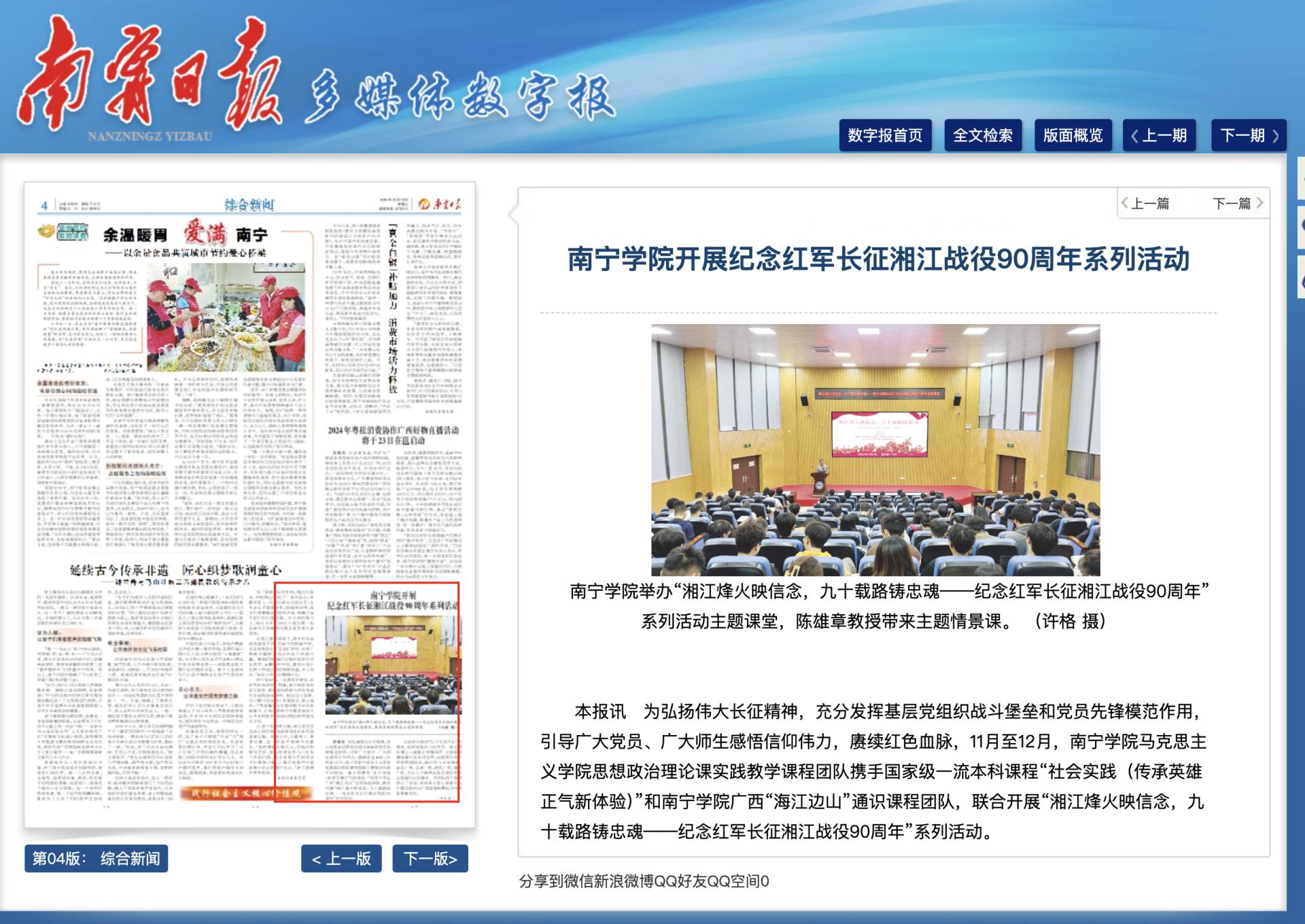 【媒体看南院】南宁日报、学习强国等平台报道Beat365中文官方网站开展纪念红军长征湘江战役90周年系列活动