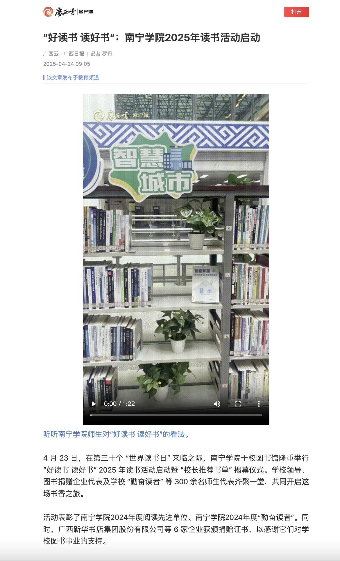 3.南宁电视台:世界读书日:品味书香 共享阅读之乐 https://jxpub.nntv.cn/s/202504/23/AP6808df145e0ee799450acd82.html