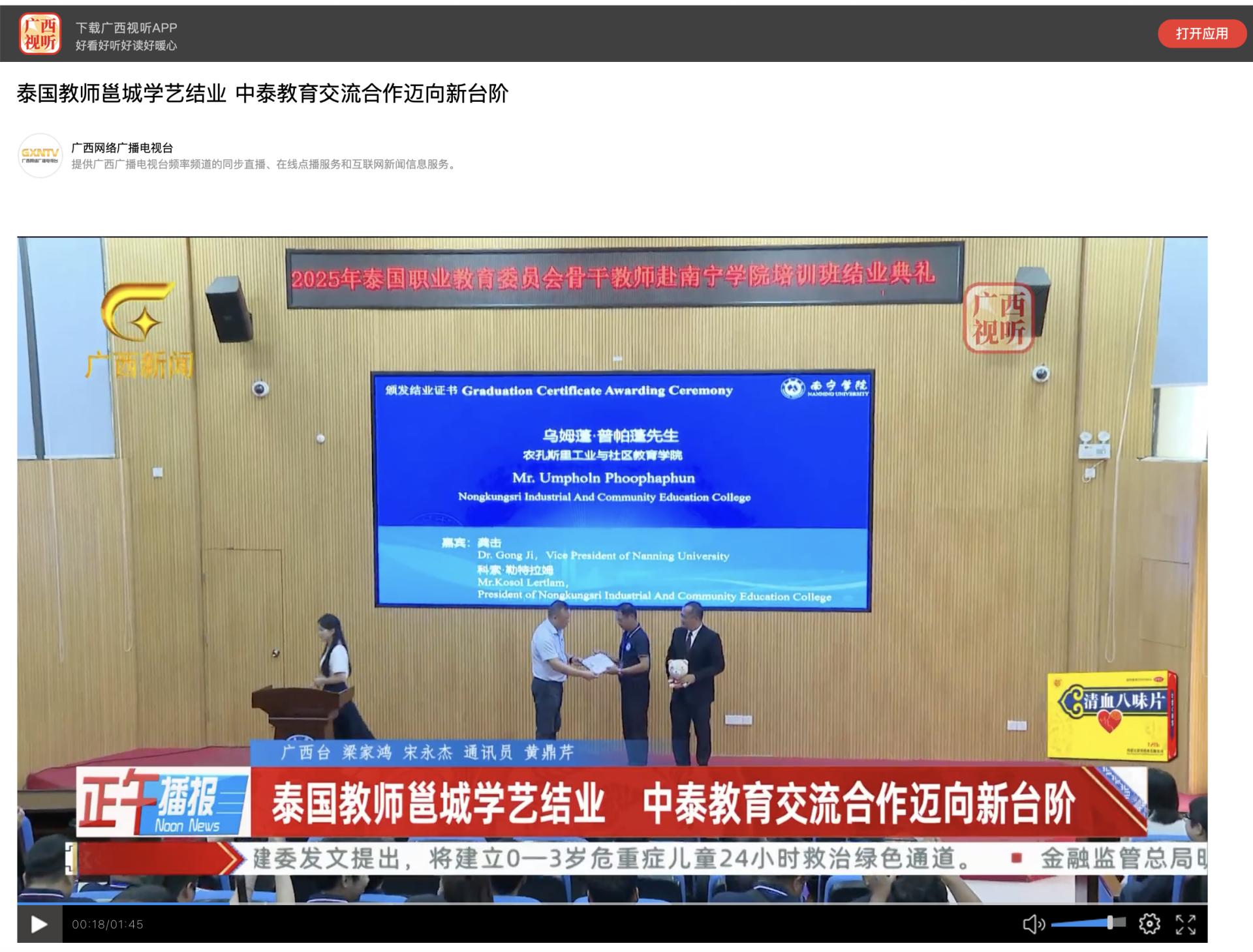 【媒体看南院】广西电视台报道泰国教师赴Beat365中文官方网站学艺结业 中泰教育交流合作迈向新台阶