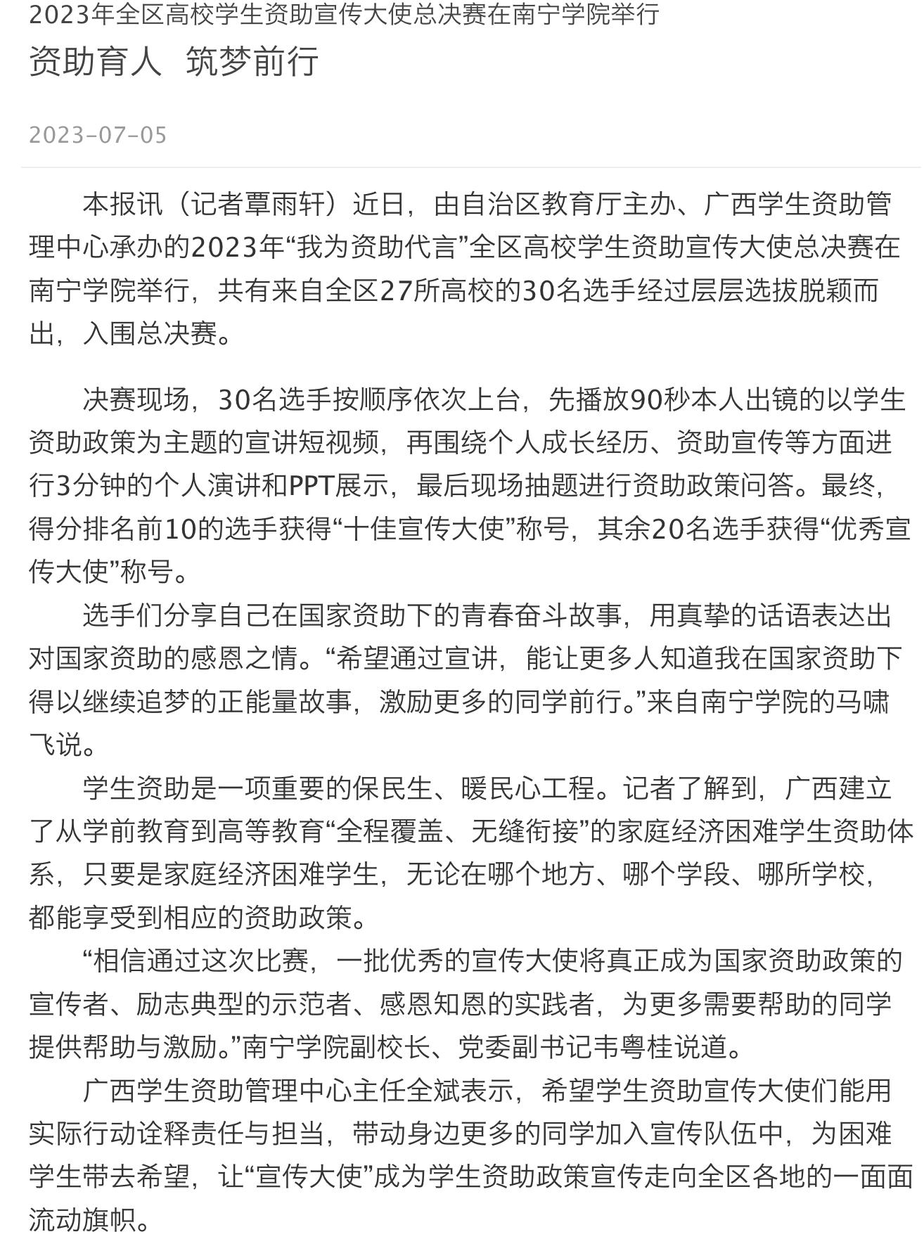 【媒体看南院】南宁日报报道2023年全区高校学生资助宣传大使总决赛在Beat365中文官方网站举行、