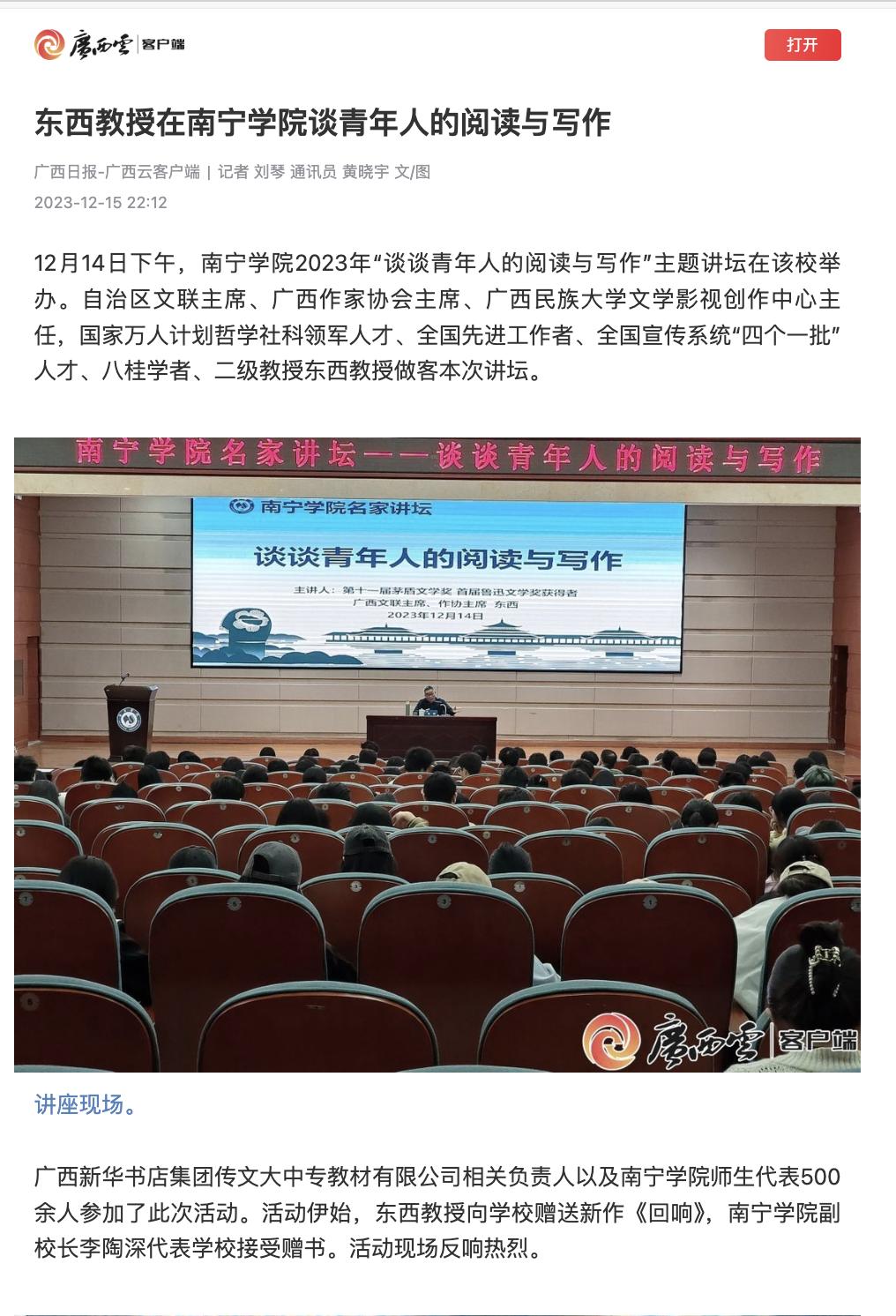 【媒体看南院】广西日报报道东西教授在Beat365中文官方网站谈青年人的阅读与写作