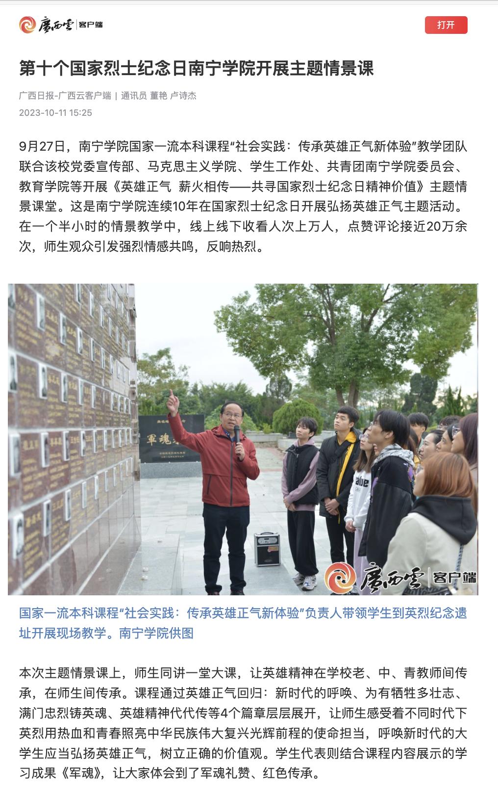 【媒体看南院】广西日报报道第十个国家烈士纪念日Beat365中文官方网站开展主题情景课